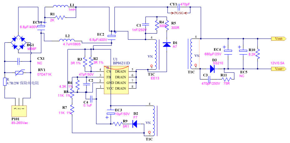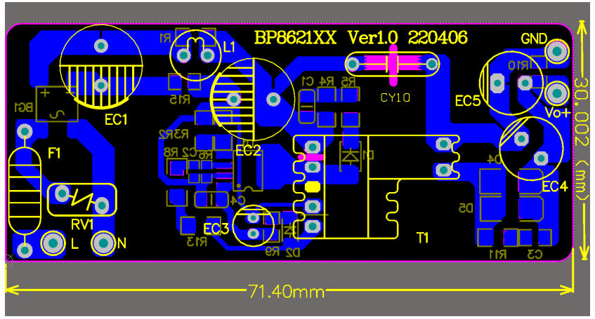在 5 W-10 W 功率段的家電輔助電源里,工程師最想要的是:省器件、低成本、一次過(guò) EMI、馬上能量產(chǎn)。深圳三佛科技提供的 BP86211D 參考設(shè)計(jì),用 單顆 SOP-7 芯片 + 650 V 集成 MOSFET,官方實(shí)測(cè) 12 V/0.5 A(6 W),待機(jī)功耗 < 65 mW,BOM 僅 24 顆器件,單面板即可過(guò) CISPR22 Class B 傳導(dǎo)。本文帶你從特點(diǎn)、電路圖、實(shí)物、BOM、變壓器到測(cè)試數(shù)據(jù),完整拆解這套“家用電器即插即用級(jí)”方案。